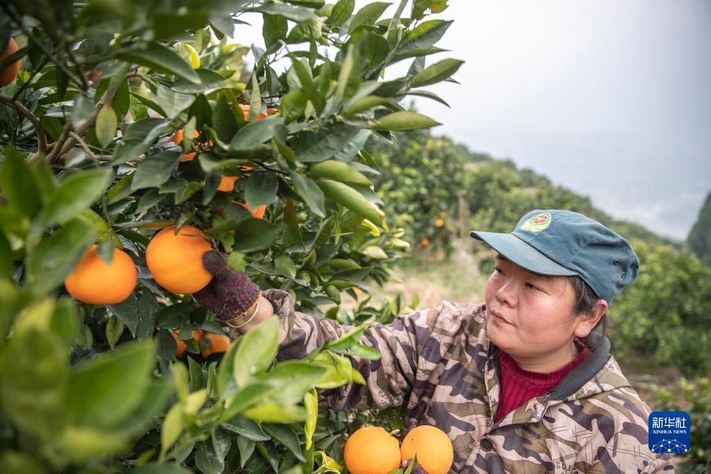 1月6日,在重庆市奉节县白帝镇八阵村,村民在采摘脐橙。