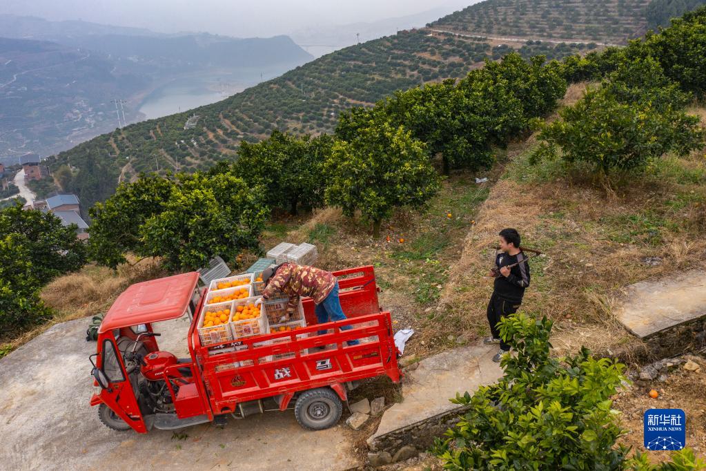 1月6日,在重庆市奉节县白帝镇八阵村,村民将刚采摘的脐橙装车(无人机照片)。