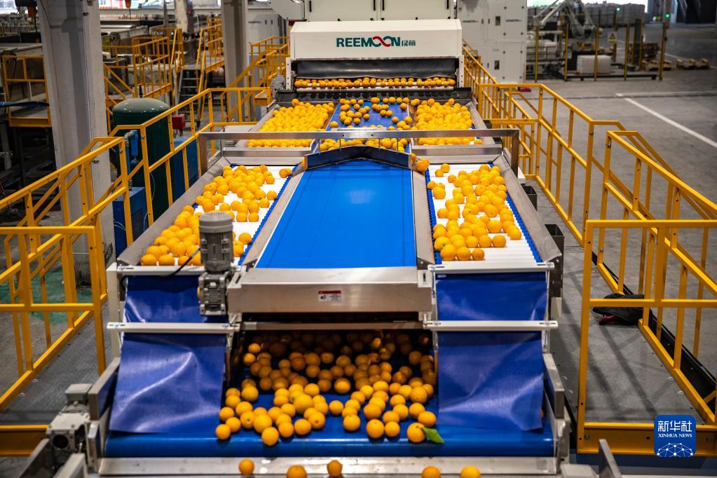 1月6日,在中国三峡柑橘(奉节脐橙)交易中心,刚采摘的脐橙通过全自动分拣线进行清洗和分级装筐。