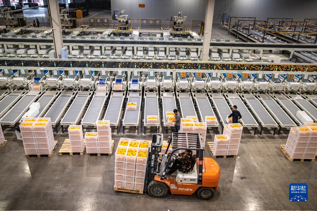 1月6日,工作人员在中国三峡柑橘(奉节脐橙)交易中心搬运经全自动分拣线分选的脐橙。