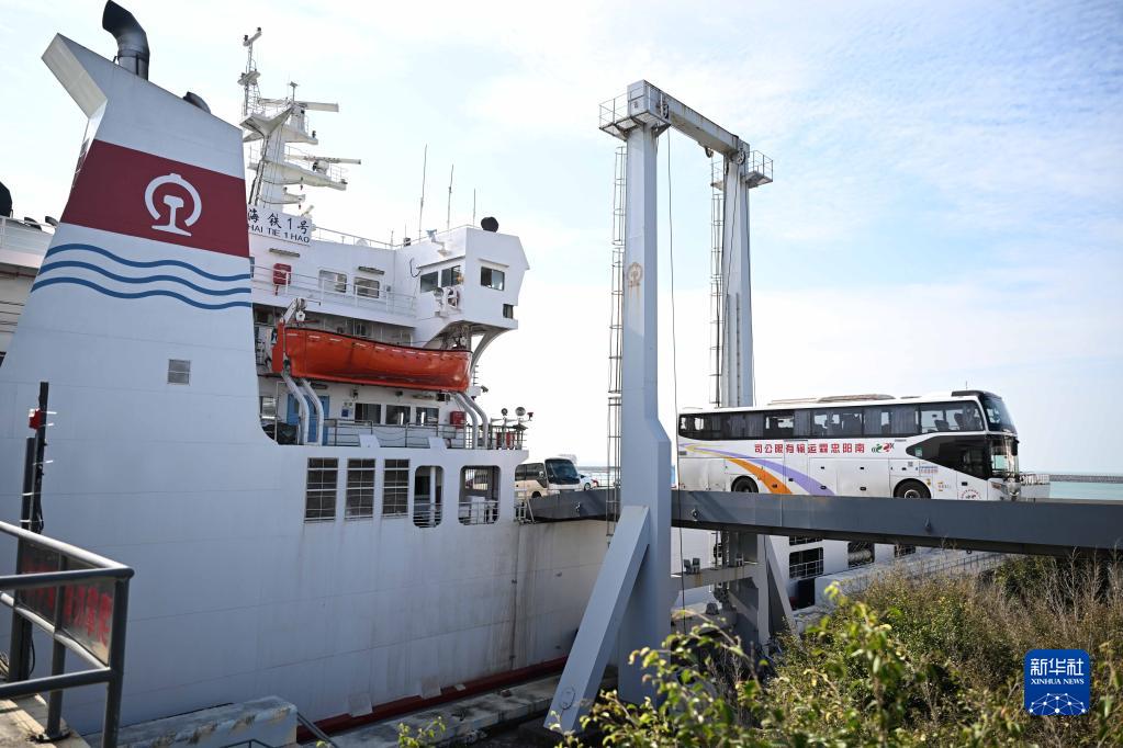 1月6日,在位于海口的粤海铁路轮渡南港码头,车辆驶离粤海铁1号轮渡。
