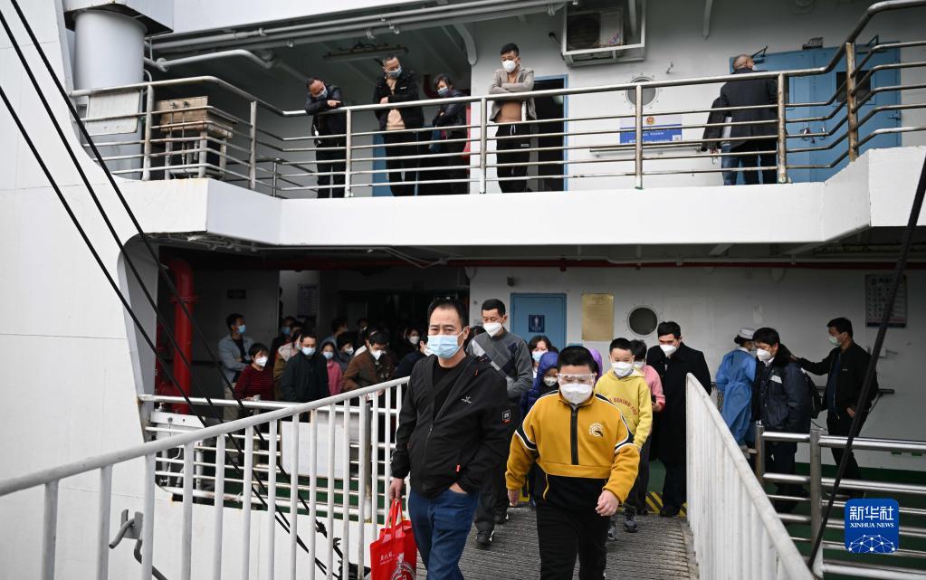 1月7日,在广东徐闻的粤海铁路轮渡北港码头,粤海铁1号轮渡上的旅客下船登陆。