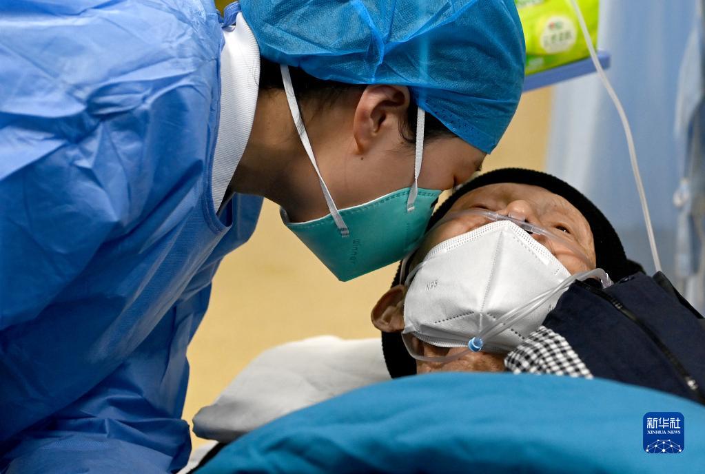 西安交通大学第一附属医院急诊科的医务人员靠近一名听力不好的患者进行问询(2022年12月31日摄)。