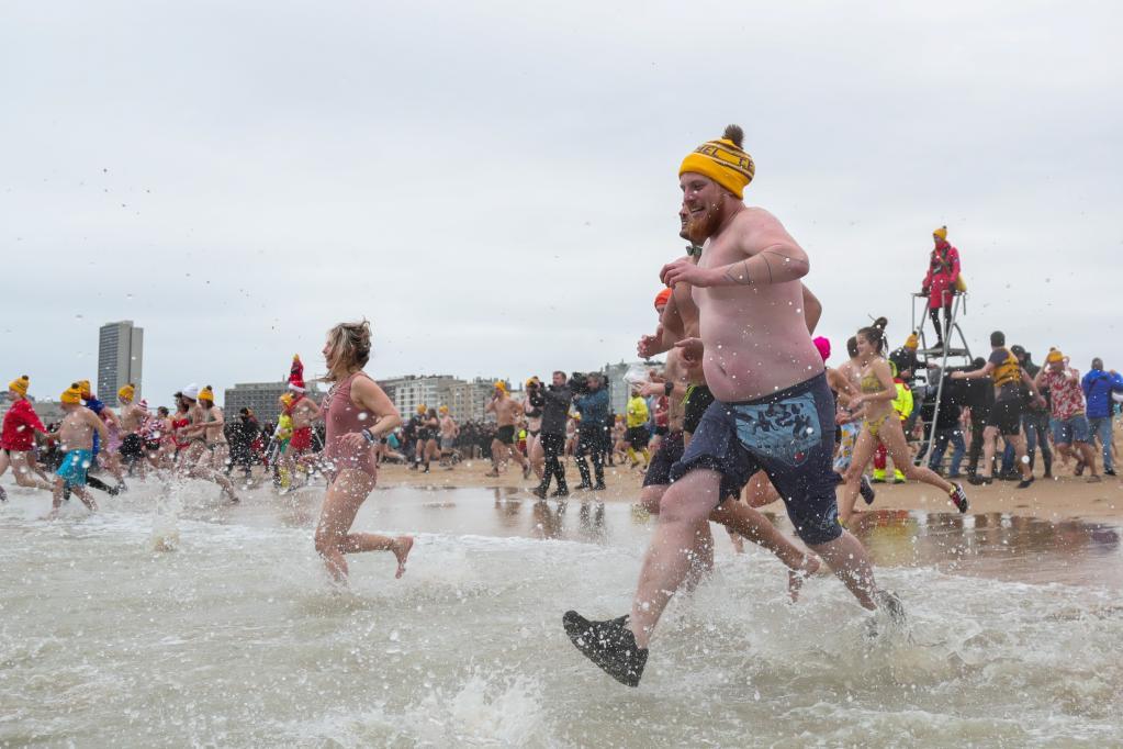 当日,比利时港口城市奥斯坦德举行传统的“跳北海庆新年”活动,数千参加者身着各式服装跳进北海。人们认为冰冷的海水能让人精神焕发,拥抱健康的一年。