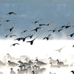 近日,在辽宁省沈阳市浑河上,万余只鸿雁、赤麻鸭、鸳鸯等候鸟迁徙来此栖息。它们成群结队在河面上嬉戏、休憩,成为冬日里一道美丽的风景线。