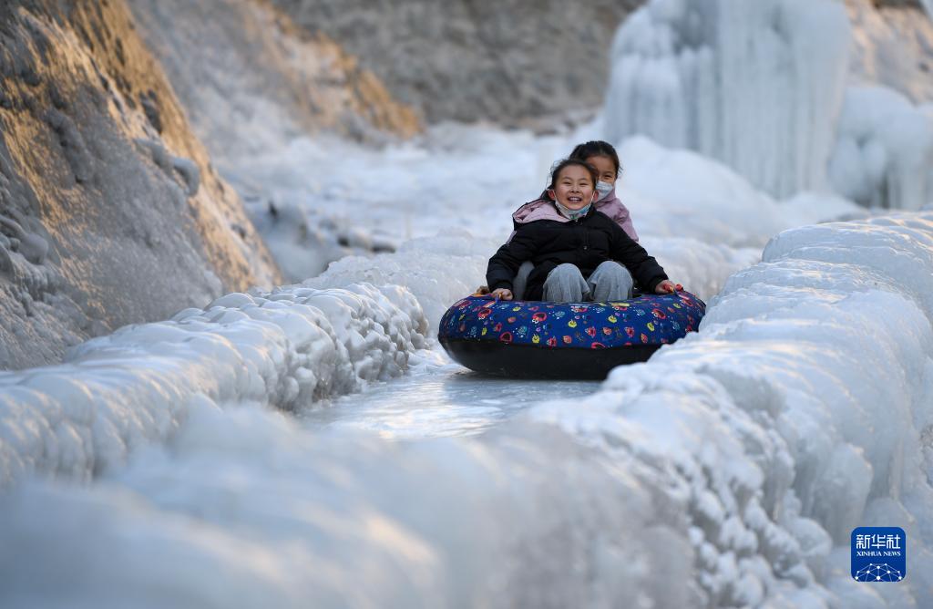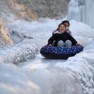 1月7日,小朋友在宁夏银川市贺兰山岩画景区体验冰道雪圈速滑。
