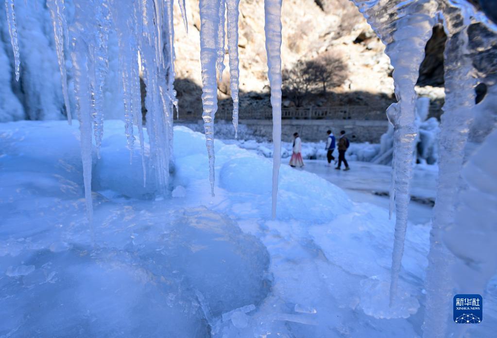 1月7日,游客在宁夏银川市贺兰山岩画景区观赏冰瀑景观。