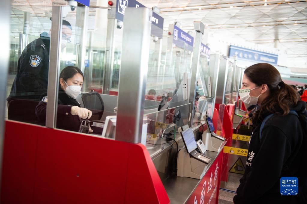 1月8日,入境旅客在首都国际机场T3-E边检查验柜台办理入境手续。