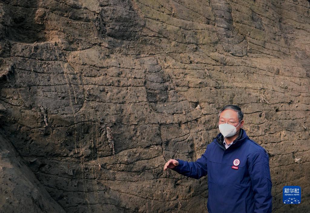 商丘市文物考古研究院院长岳洪彬在河南商丘宋国故城遗址讲解宋代城墙夯土发现的榫卯槽(1月6日摄)。