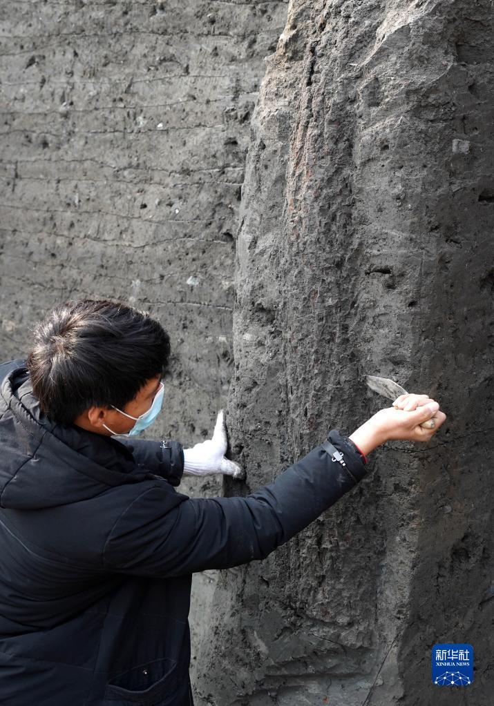 考古工作人员在河南商丘宋国故城遗址发掘现场清理永定柱四周夯土(1月6日摄)。