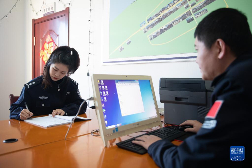 1月8日,史先强和妻子沈欣在洛古河夫妻警务室里进行信息录入工作。