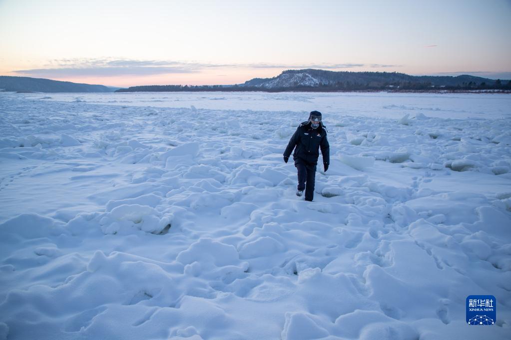 1月8日,史先强在洛古河村旁封冻的黑龙江江面上进行边境巡逻。