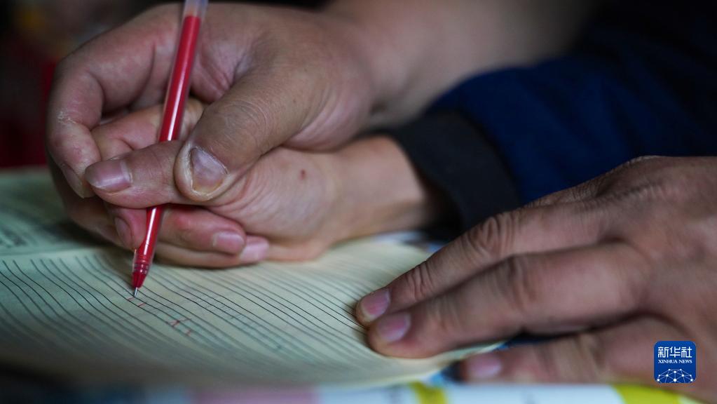 2022年5月28日,江西省宜春市袁州区洪塘镇丰顶山中心小学校长韩富在一名学生家中纠正其握笔的姿势。该校是一所寄宿制小学,学生60%都是留守儿童。
