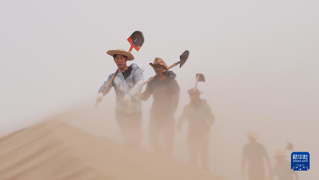 2022年7月3日,在新疆且末县,张选忠(左一)、田野(左二)等老兵在塔克拉玛干沙漠里顶风前行,对下一步计划种植区进行地形勘查。