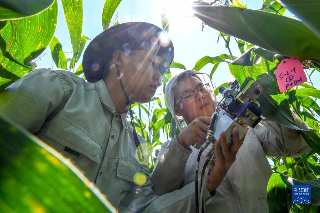 2022年8月17日,在吉林省梨树县,“90后”在读博士生沙野(右)和崔帅在试验田里测量玉米光合作用。