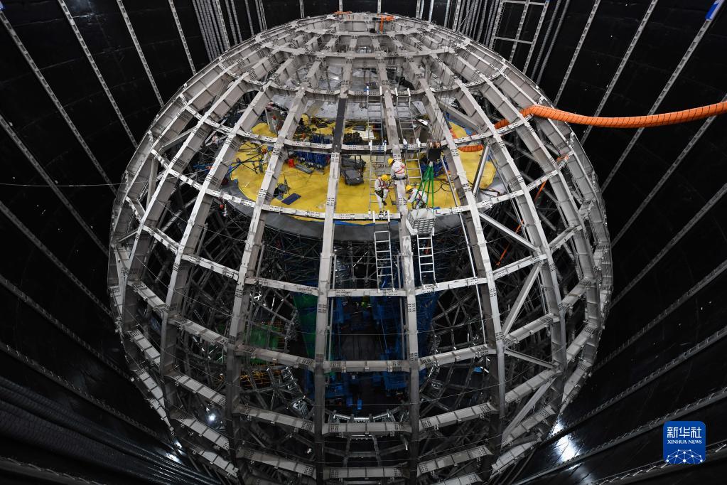 这是2022年9月2日拍摄的位于地下700米的江门中微子实验探测器,呈现出巨大的球形结构。