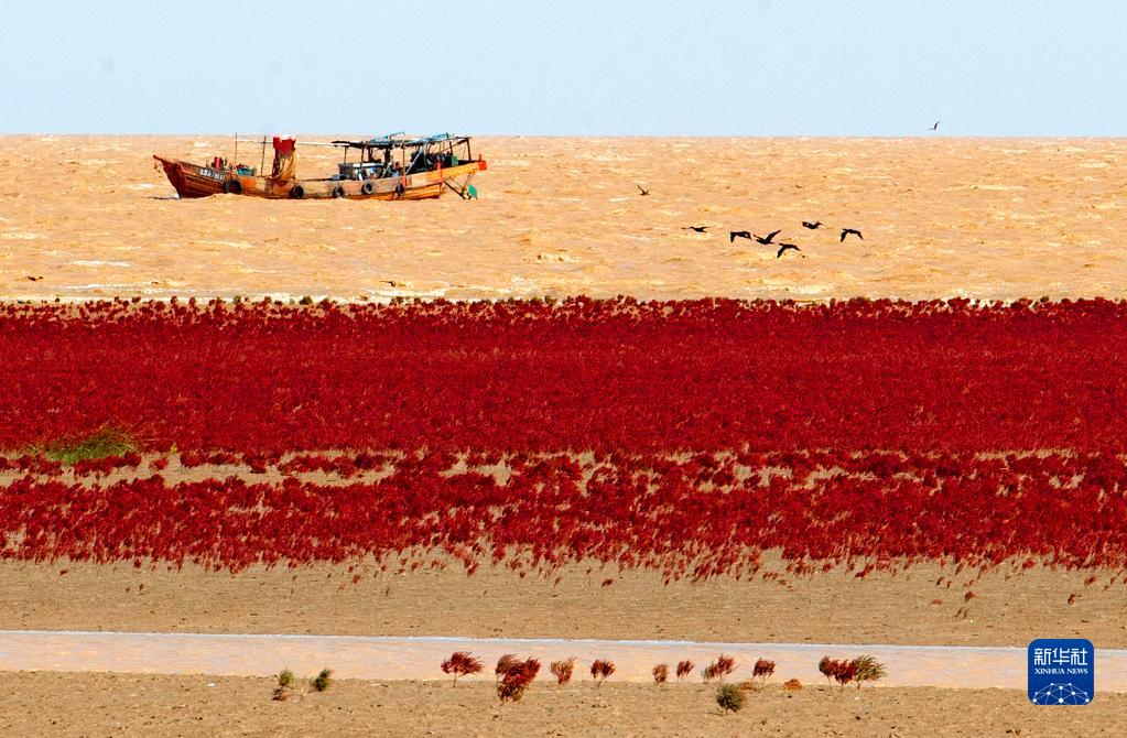 近年来,山东黄河三角洲国家级自然保护区坚持以生态的办法治理生态,实施湿地修复项目,翅碱蓬给滨海滩涂湿地铺上“红地毯”,成为秋季黄河口独特的风景。
