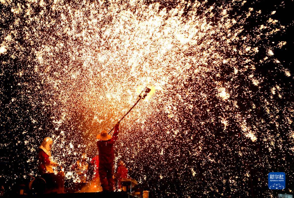 2022年2月14日,在河南省洛阳市洛龙区隋唐城遗址植物园,民俗艺人为市民、游客表演“打铁花”,喜迎元宵佳节。