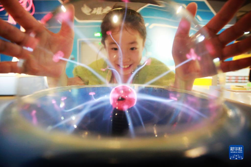 2022年10月1日,在江苏扬州科技馆,小朋友在体验“辉光球”。当日是国庆假期第一天,人们以多种方式迎接长假,欢度佳节。