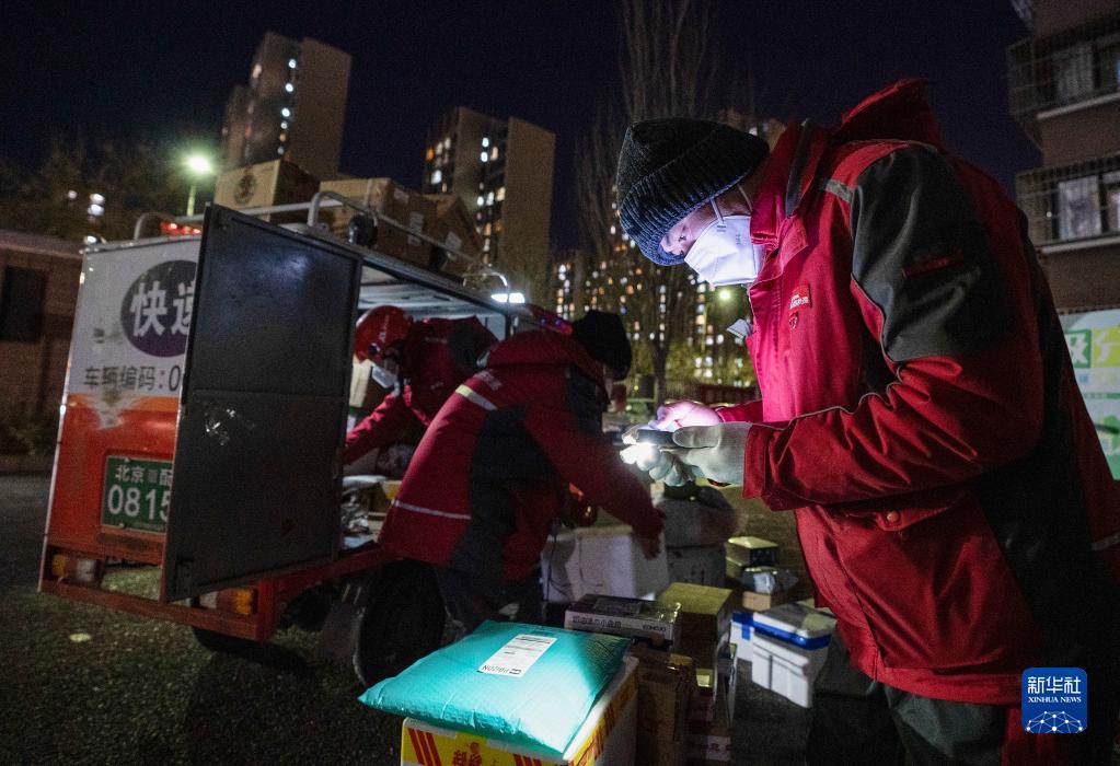 2022年12月15日,在北京市大兴区新源时代小区,从西安赴京支援的快递小哥王选军(前)、齐帅龙(后左)和高兴兴按照楼号分货。