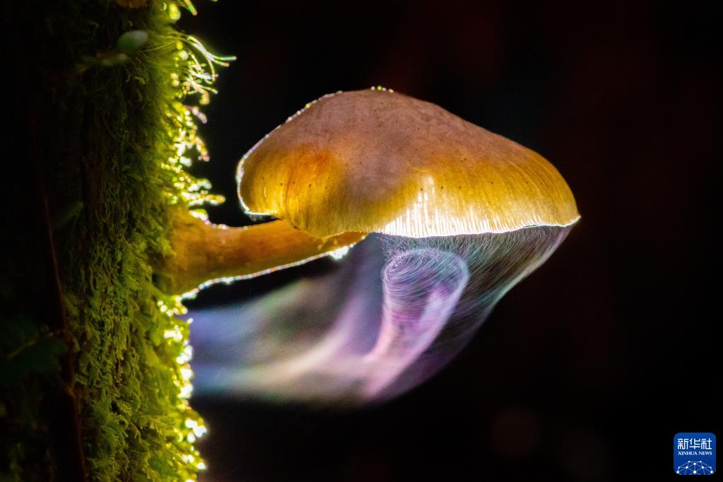 2022年3月30日,在新西兰南岛福克斯西海岸温带雨林中,一簇蜜环菌在暗夜中播撒孢子。