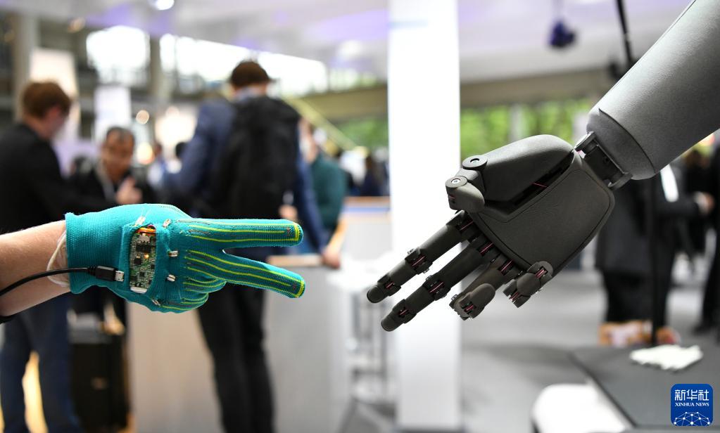 2022年5月30日,在德国汉诺威工业博览会上,一款可感知人类手势的智能机器人(右)与观众互动。受新冠疫情影响中断两年线下活动后,汉诺威工业博览会2022年恢复线下举行。