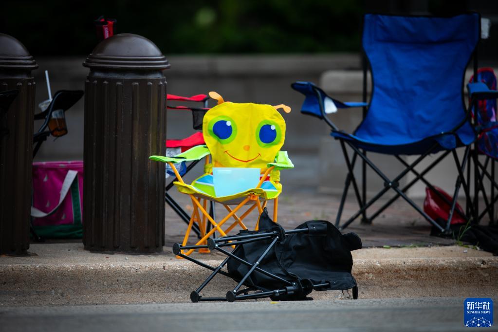 2022年7月4日,观众座椅遗留在美国伊利诺伊州海兰帕克市“独立日”游行的枪击现场。海兰帕克市“独立日”游行枪击事件造成至少7人死亡、数十人受伤。