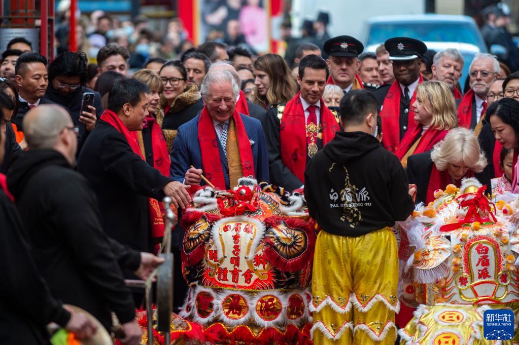 2022年2月1日,英国王储查尔斯(中间蓝衣者)与夫人卡米拉(前排右二)在伦敦中国城与当地华侨华人共庆中国农历虎年春节。
