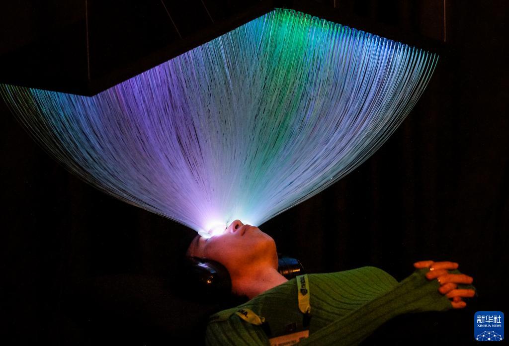2022年8月9日,在加拿大温哥华举行的2022国际计算机协会图形图像学会年会上,参观者体验一款可将颜色与光线通过光纤投射到眼睑上的设备。