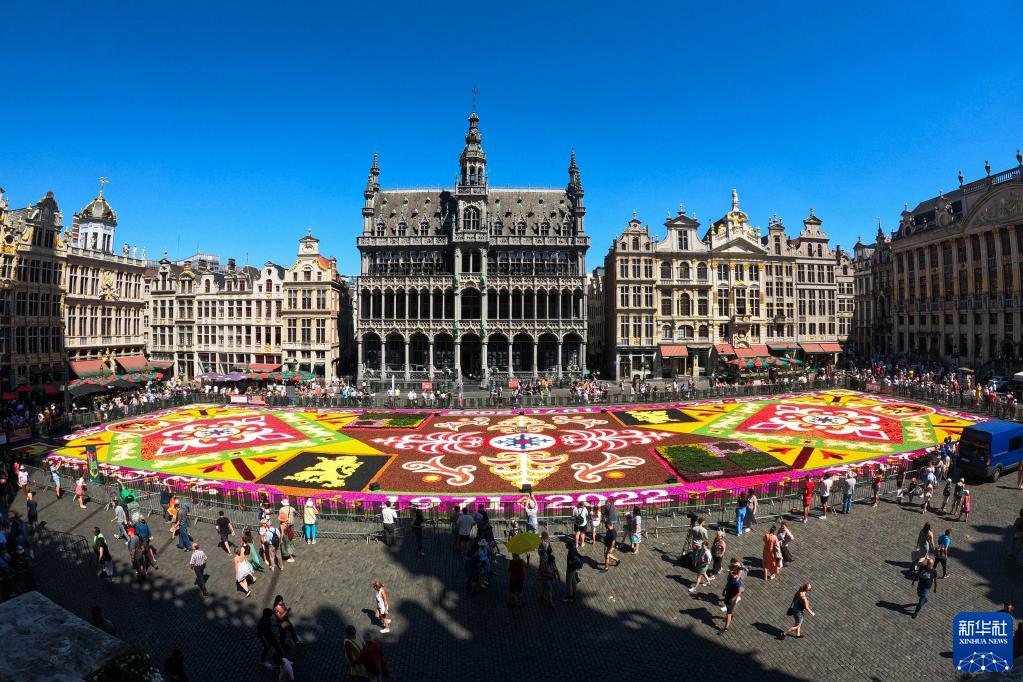 2022年8月12日,民众在比利时布鲁塞尔大广场参观“鲜花地毯”。受新冠疫情的影响,本应于2020年举办的第22届“鲜花地毯”节延期至2022年举行。