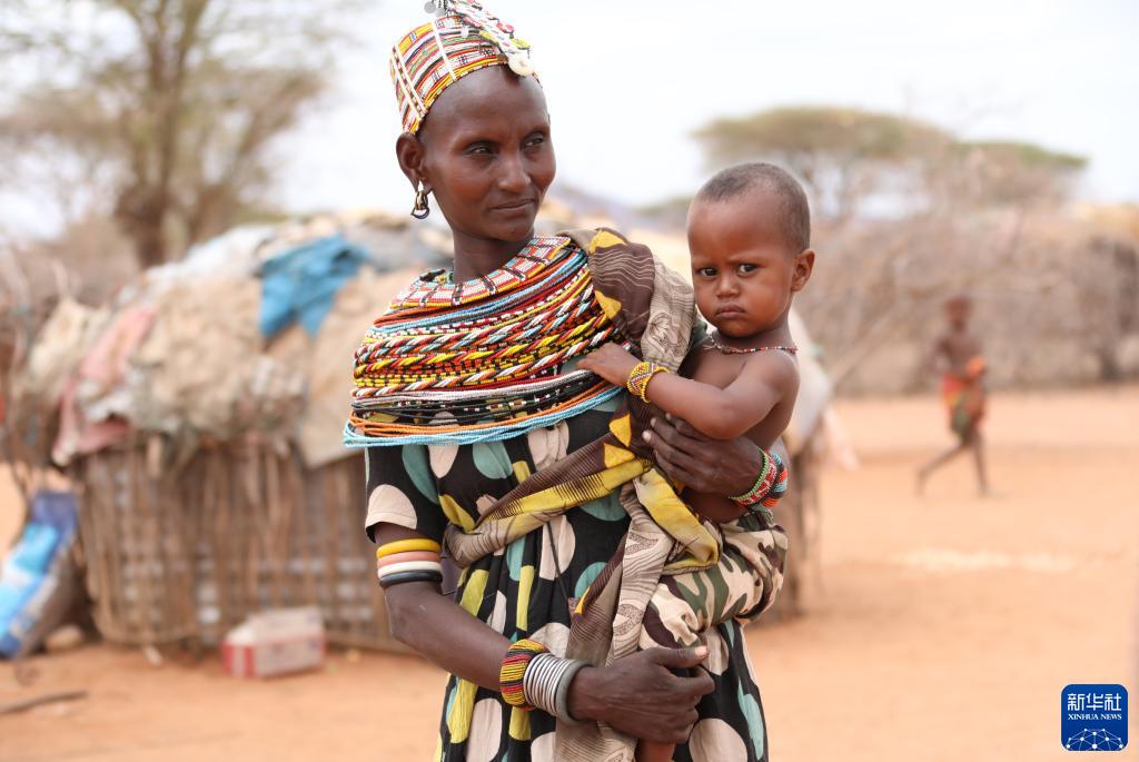 2022年8月26日,在肯尼亚马萨比特郡莱萨米斯镇受干旱侵袭的村庄内,一名女子抱着孩子。非洲之角地区经历严重干旱,索马里、埃塞俄比亚和肯尼亚超过1300万人受到严重饥饿的威胁。