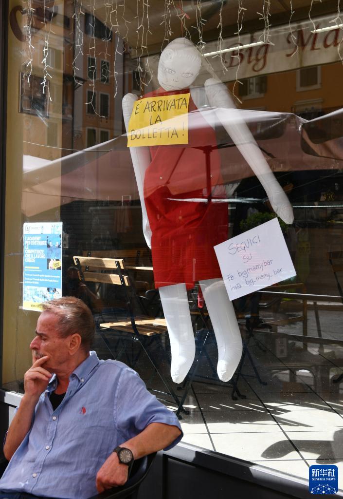 2022年9月17日,意大利罗马一家餐馆摆出人偶和“账单已到!”字样的纸牌,以此表达对餐馆收到的高额电费账单的不满。受欧洲能源危机影响,意大利经营者和民众的能源支出普遍上涨,不堪重负。