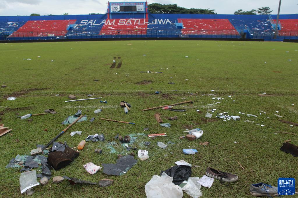 这是2022年10月3日在印度尼西亚东爪哇省玛琅市事发球场内拍摄的景象。10月1日当地发生球迷冲突事件,造成120多人死亡。