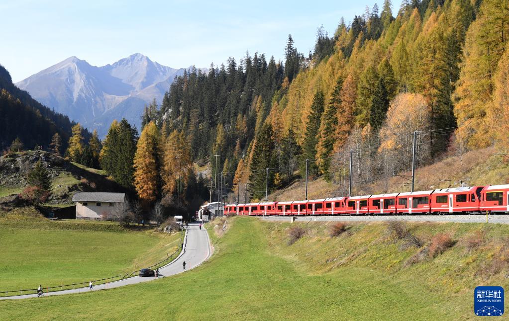 2022年10月29日,由100节车厢组成、长达1910米的世界最长窄轨客运列车在瑞士阿尔卑斯山区行驶。