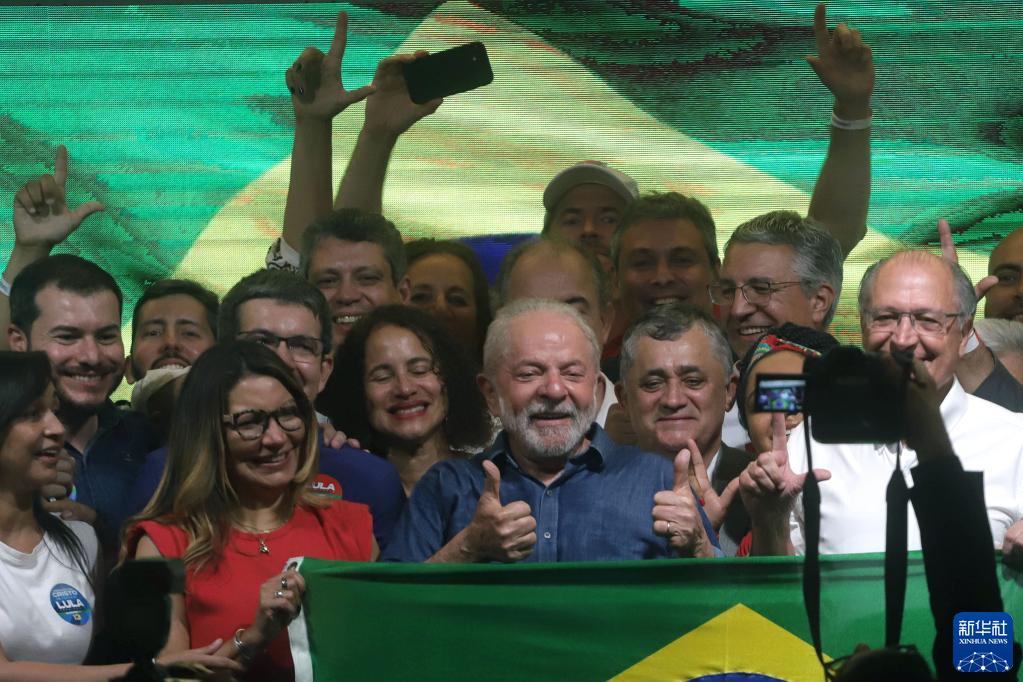 2022年10月30日,劳工党候选人、前总统卢拉(前中)在巴西圣保罗参加大选庆祝活动。卢拉在当天举行的巴西大选第二轮投票中获胜,当选新一任巴西总统。