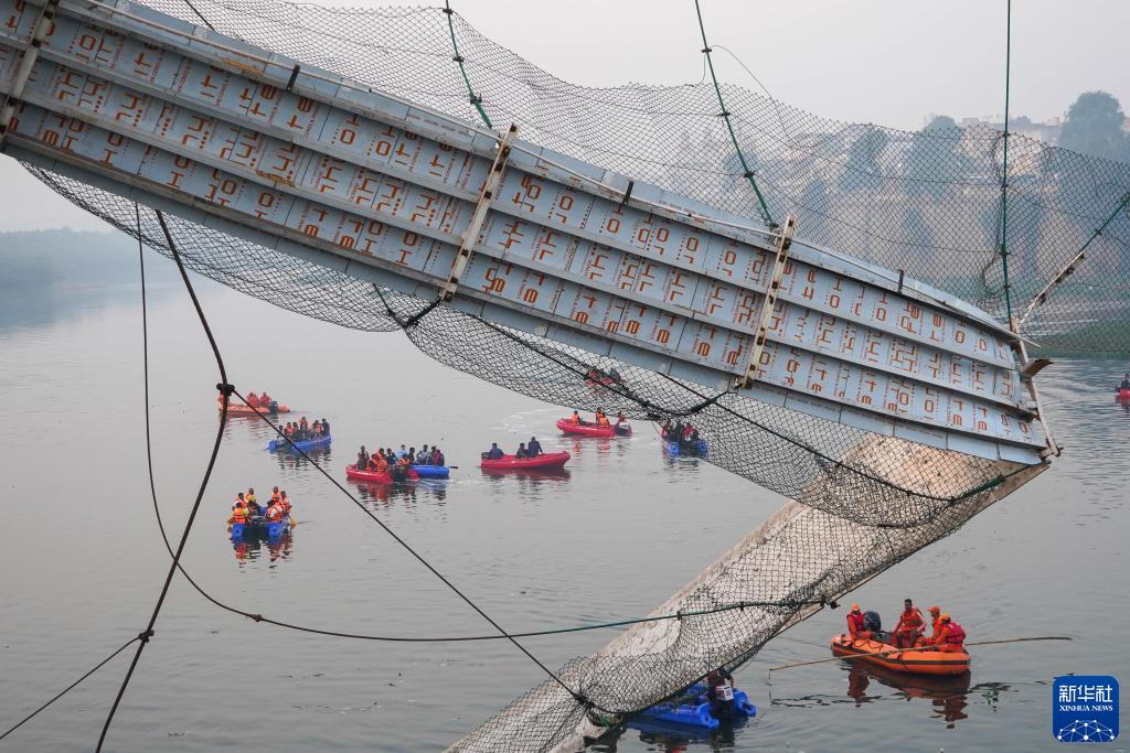 2022年10月31日,救援人员在印度古吉拉特邦的桥梁断裂事故现场搜救。10月30日晚,当地默丘河上的一座拉索桥突然断裂,大量人员落水,事故造成百余人死亡。