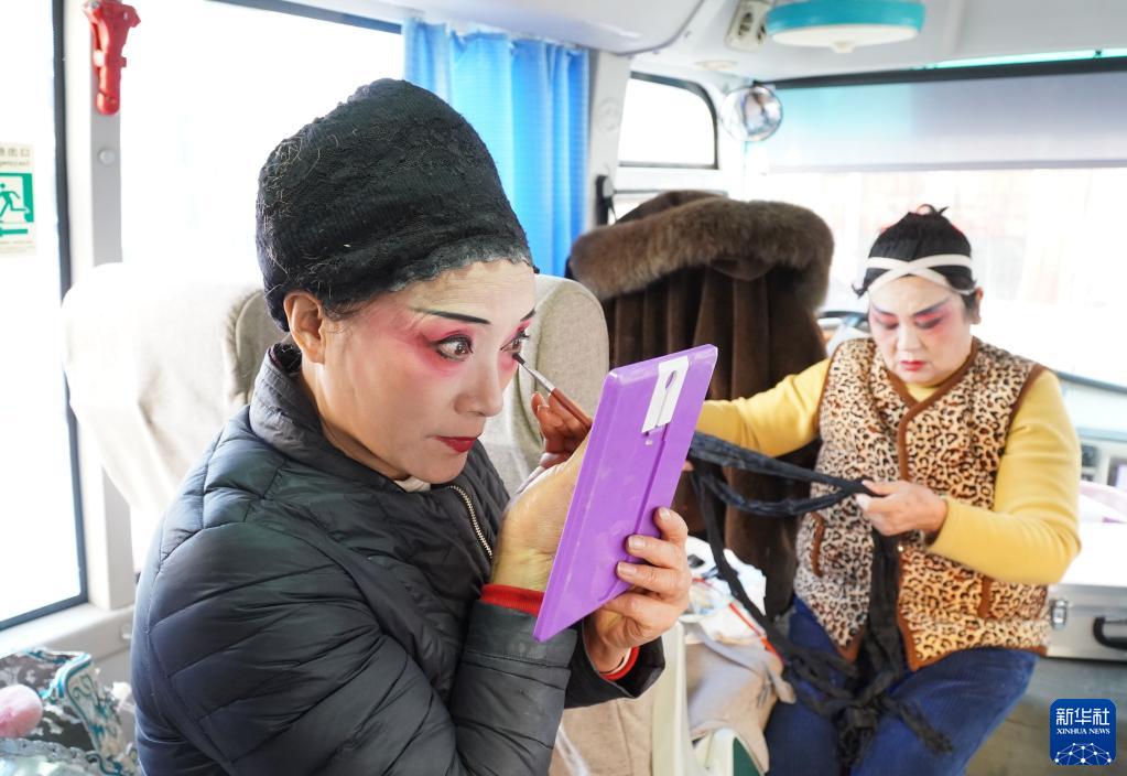 1月9日,在山东省郓城县黄集镇,郓城县文化馆戏曲演员赵爱荣(左)在面包车内的临时化妆间化妆。