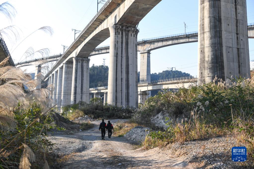 1月8日,铁路警察王云(右)和谢源在铁路沿线进行线路安全巡查。