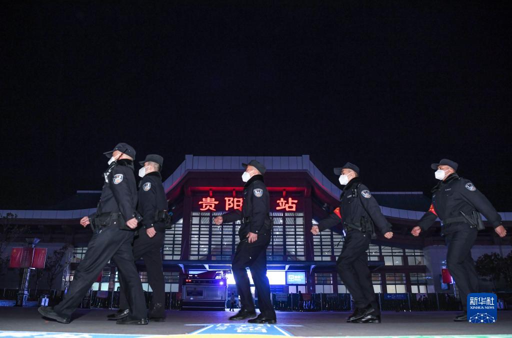 1月8日,铁路警察王云(左一)和谢源(左二)与其他执勤民警在贵阳东站进行站区巡查。