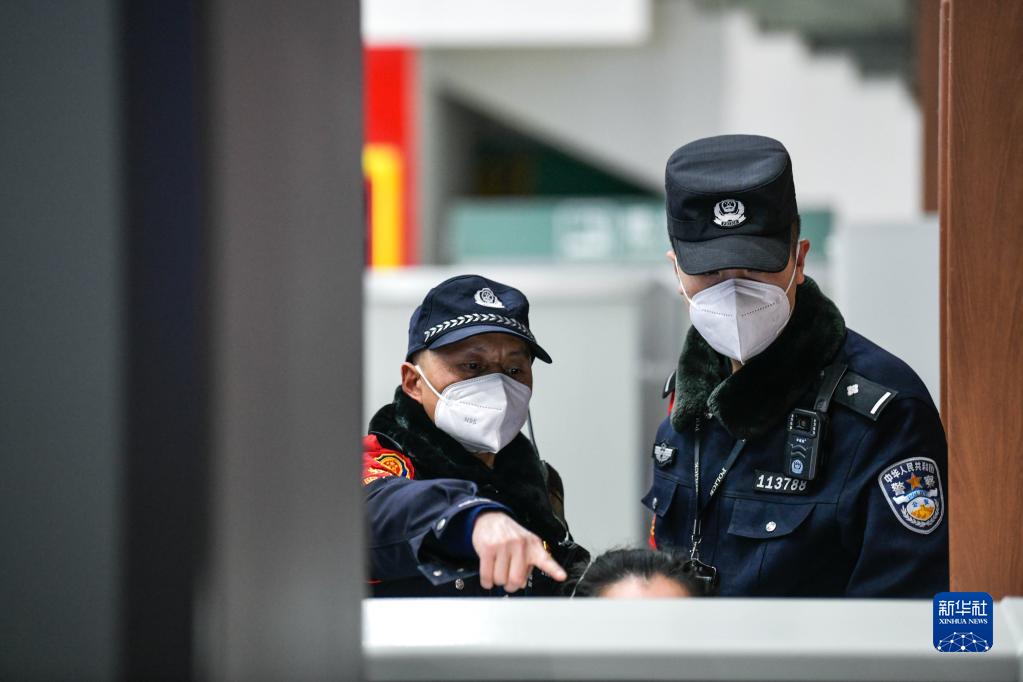 1月8日,铁路警察王云(左)和谢源在贵阳东站督导旅客进站安检情况。