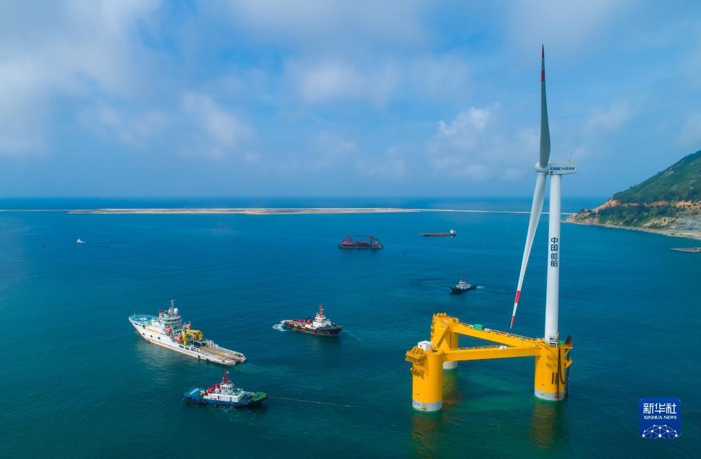 2022年5月29日,国内首台深远海浮式风电装备“扶摇号”从广东省茂名市广港码头拖航前往罗斗沙海域进行示范应用(无人机照片)。