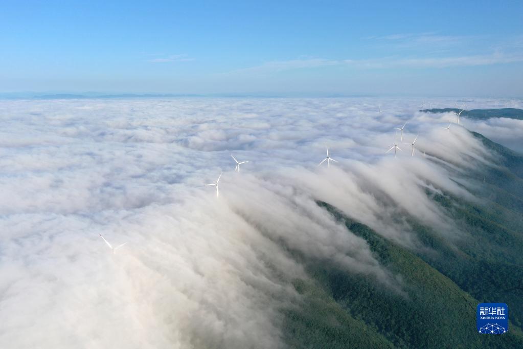 2022年5月29日,湖北省荆门市城郊圣境山现壮观的瀑布云景观,风机在云中若隐若现(无人机照片)。