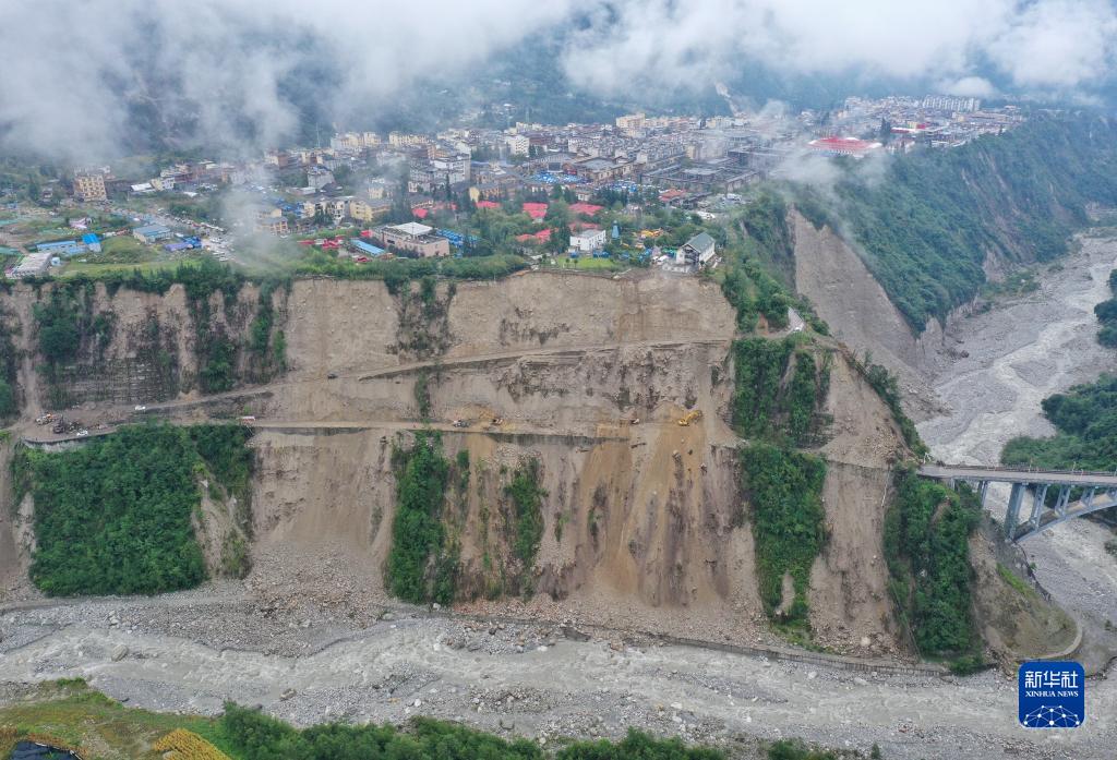 2022年9月9日,抢险人员在抢通磨西镇附近道路(无人机照片)。四川泸定磨西镇出现降雨,加大了灾区道路抢通抢险难度。