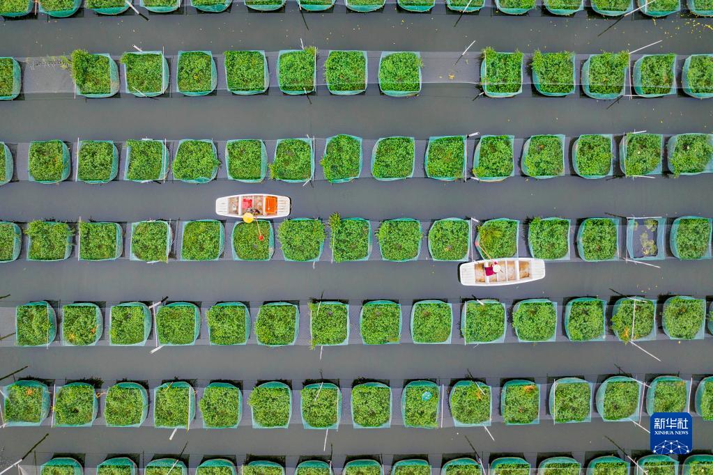 2022年11月12日,湖北省孝感市云梦县开发区和平村村民在池塘中喂养黄鳝(无人机照片)。