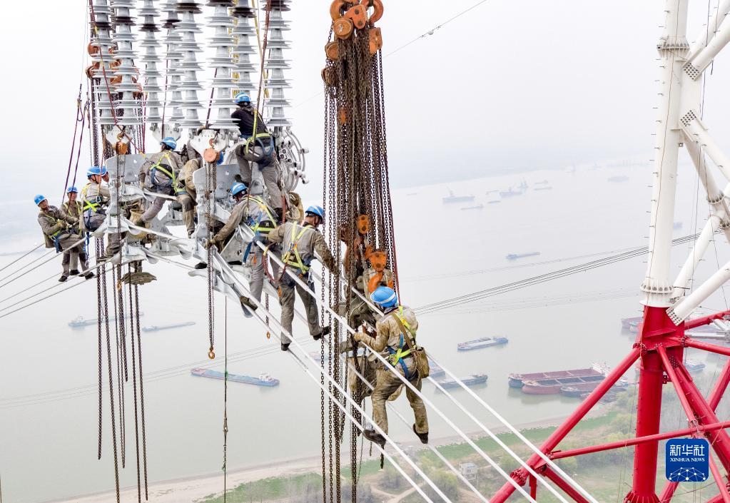 2022年3月13日,在安徽芜湖的长江边,安徽送变电工程有限公司施工人员在高空进行特高压输电线路跨江作业(无人机照片)。3月14日,白鹤滩—江苏±800千伏特高压直流输电工程安徽段跨越长江放线工程完成最后6根导线的展放,标志着特高压“白江线”安徽段长江大跨越线路贯通。