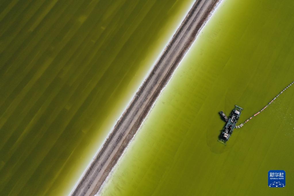 2022年4月1日,采盐船在青海盐湖工业股份有限公司钾肥分公司的盐湖工作(无人机照片)。每年3月至4月是春耕备耕关键期,青海盐湖工业股份有限公司钾肥分公司的各条生产线满负荷生产,助力春耕备耕。
