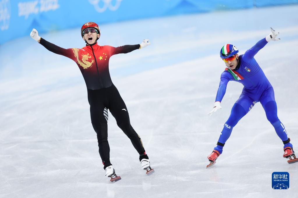2022年2月5日,中国队选手武大靖(左)在比赛后庆祝。