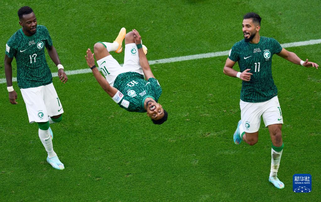 2022年11月22日,沙特阿拉伯队球员萨勒姆-达瓦萨里(中)在打入球队第二粒进球后庆祝。