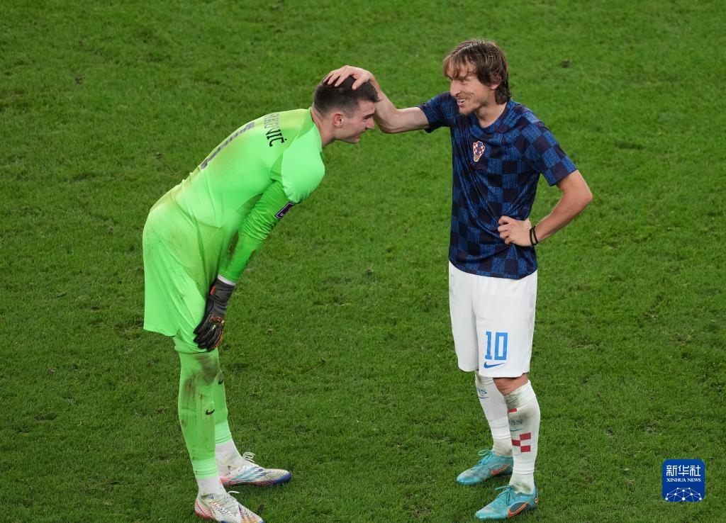 2022年12月5日,克罗地亚队球员莫德里奇(右)与守门员利瓦科维奇在比赛后庆祝。