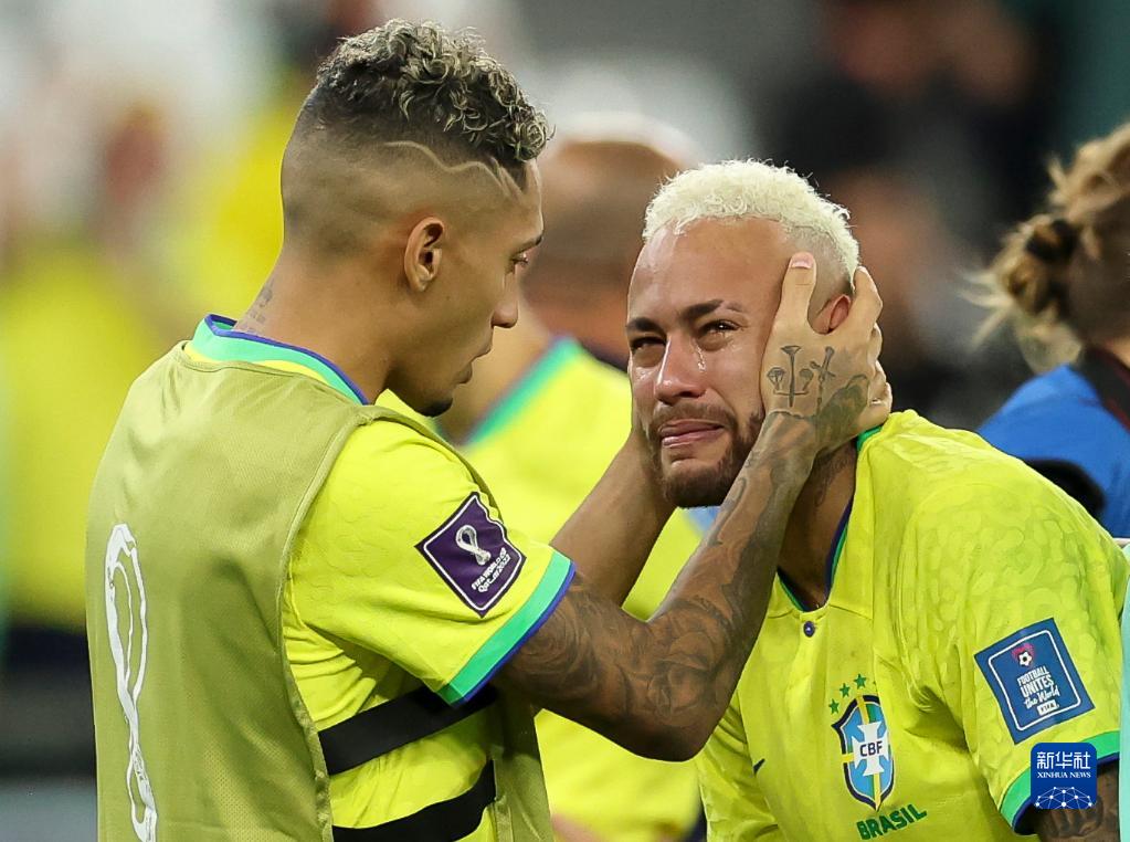 2022年12月9日,巴西队球员拉菲尼亚(左)在比赛后安慰队友内马尔。